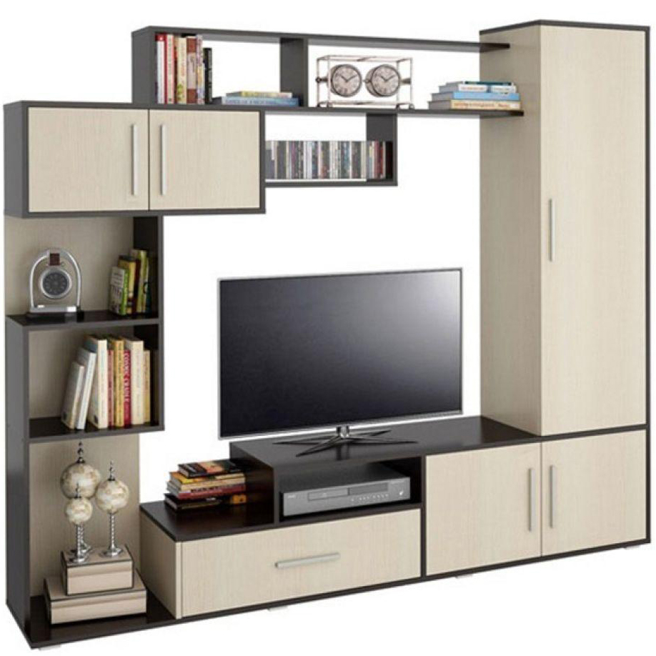 Поскольку в одной конструкции сочетаются разные по размеру, форме, открытые и закрытые фрагменты, гостиная не выглядит массивной и оптимально подходит для установки даже в небольшие помещения. Конструкции можно размещать как вдоль одной стены, так и в разных участках комнаты.