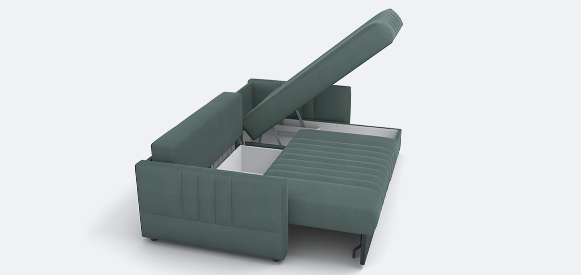Вместительные системы хранения — бельевые ящики в основании дивана и оттоманке удобны для постельных принадлежностей и бытовых мелочей.