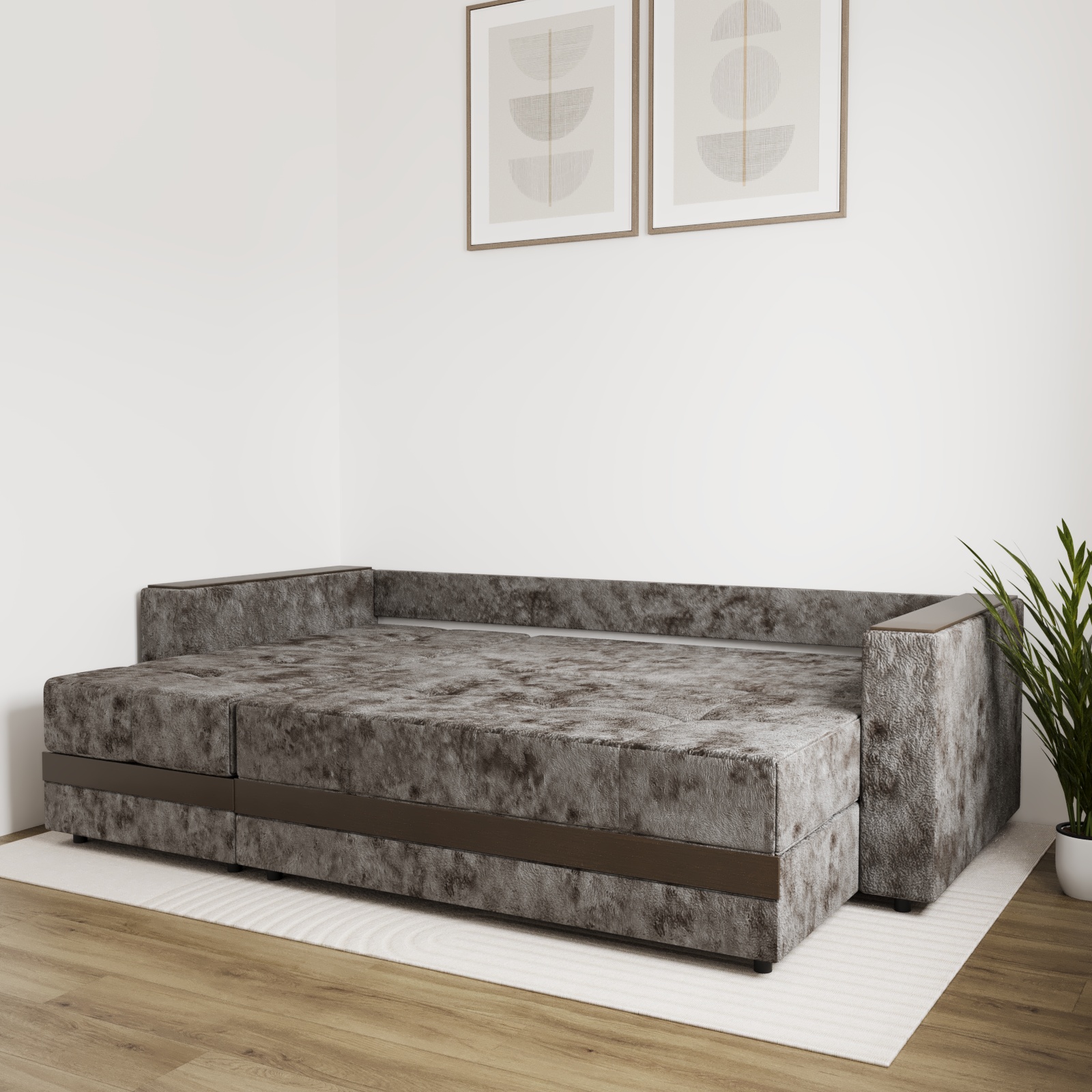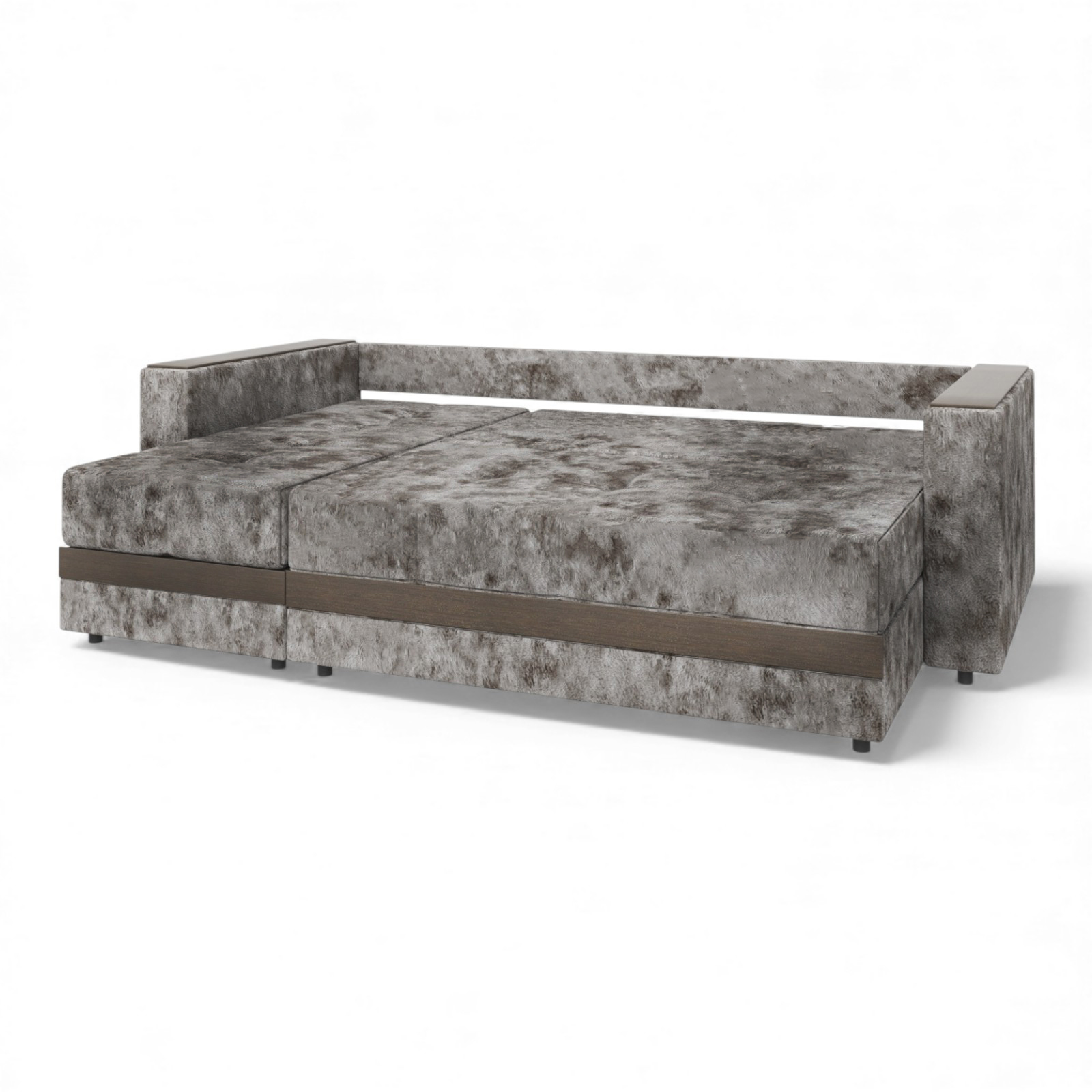 - • Обивка дивана выполнена из износостойкого велюра. Практичного и долговечного материала.