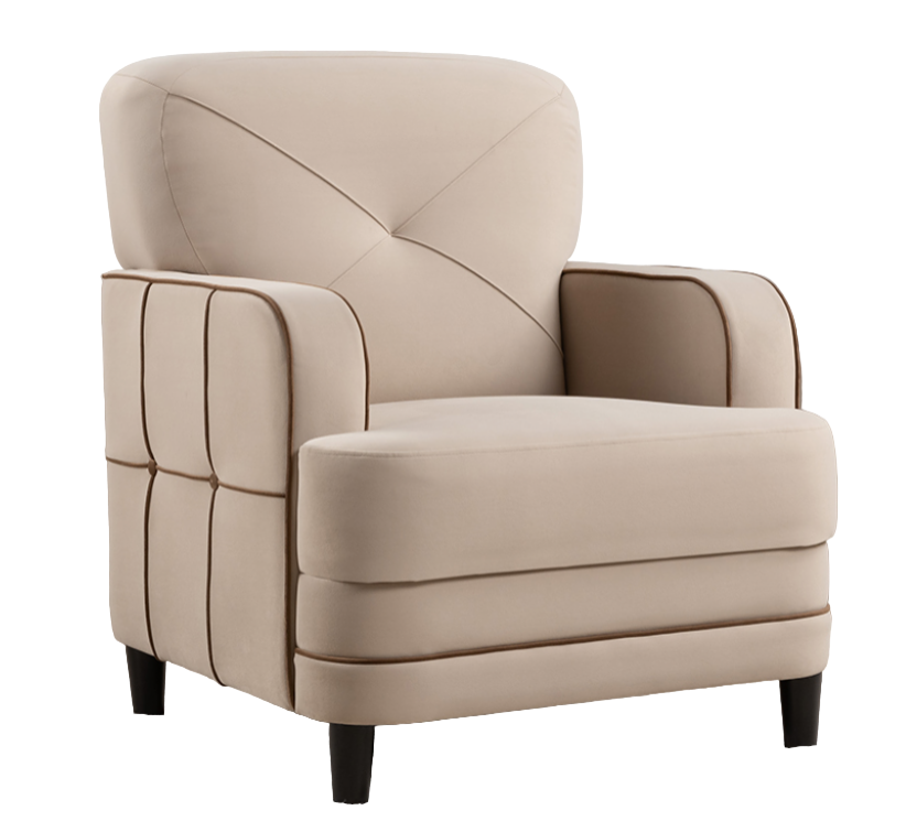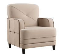 Декоративные канты на вставке подлокотников. Пуговицы в местах пересечения кантов на подушке и вставке подлокотников. По торцам подлокотников и думках контрастный декоративный кант. Защипы на сиденье и подушке.
