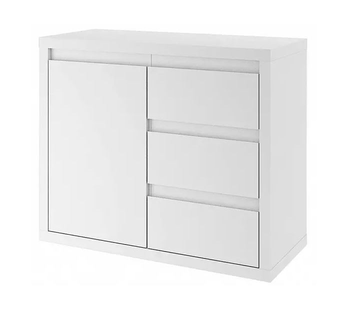 Комод "Норден" оборудован тремя выдвижными ящиками для текстиля, одежды и постельного белья, а также закрытыми полками, на которых удобно разместить посуду и аксессуары.
