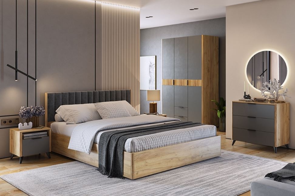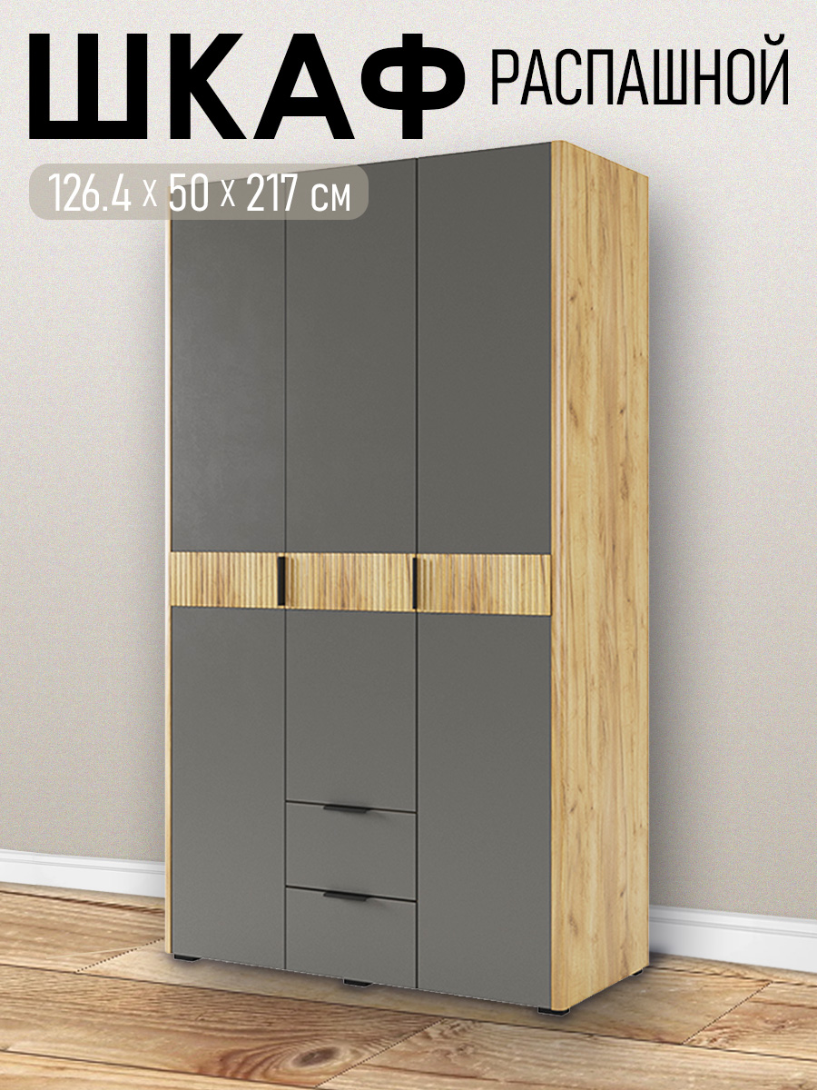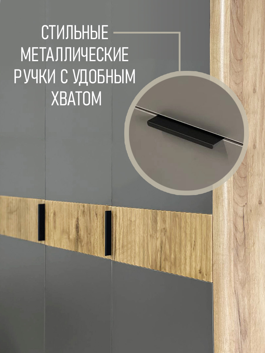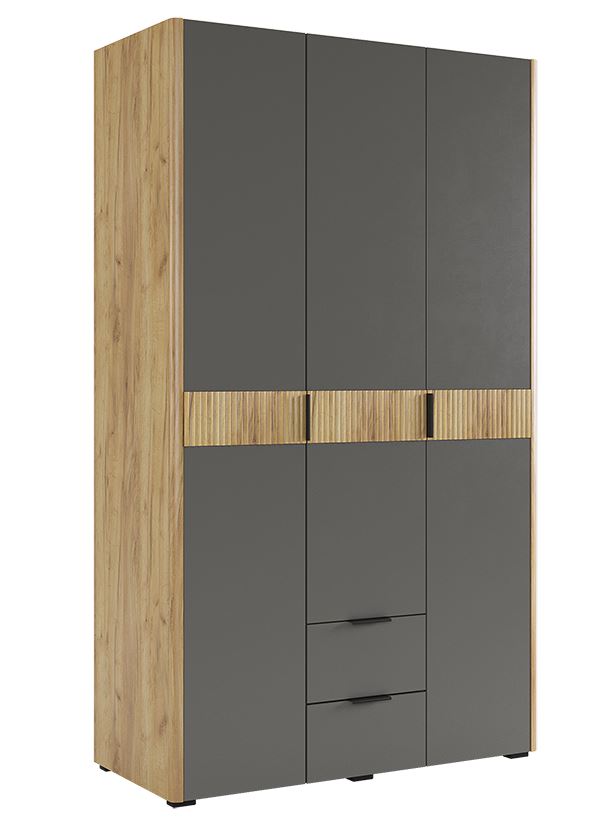 Трехдверный шкаф «Адам» — это вместительное и стильное решение для спальни, детской или прихожей. Модель сочетает в себе продуманное внутреннее наполнение, безопасную конструкцию с полукруглыми углами и выразительный дизайн с декоративной фрезеровкой «вельвет» и большим зеркалом. Контрастное сочетание цветов «дуб крафт золотой» и «графит серый» добавляет интерьеру современного звучания.
