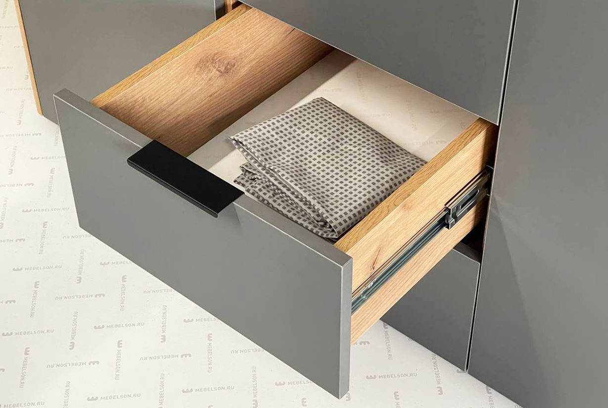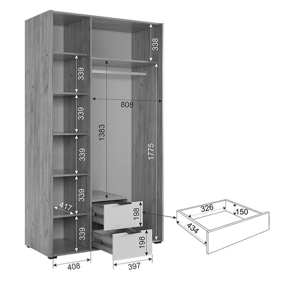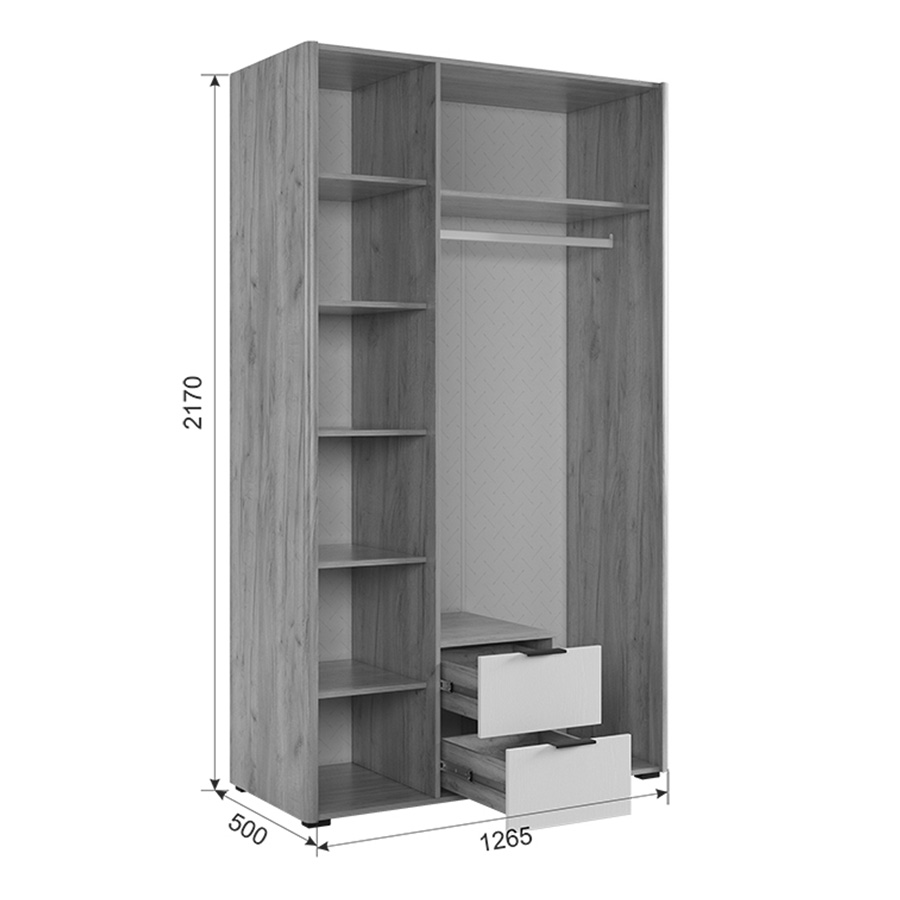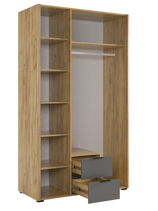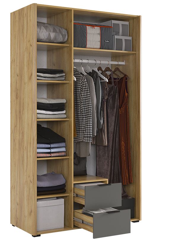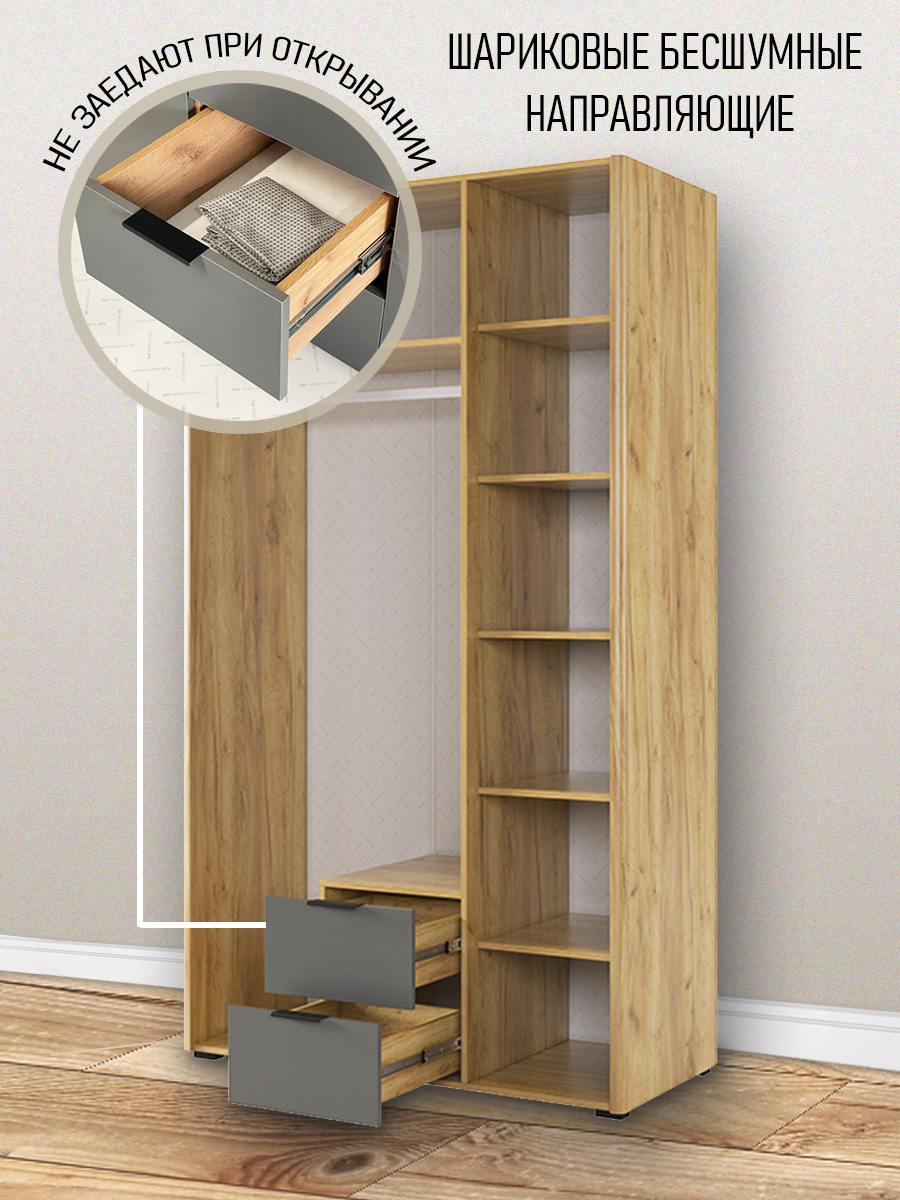 Вместительное наполнение: 6 просторных полок, 2 выдвижных ящика на шариковых направляющих и металлическая штанга для одежды. Всё необходимое для хранения вещей найдёт своё место.