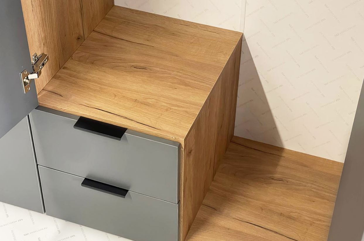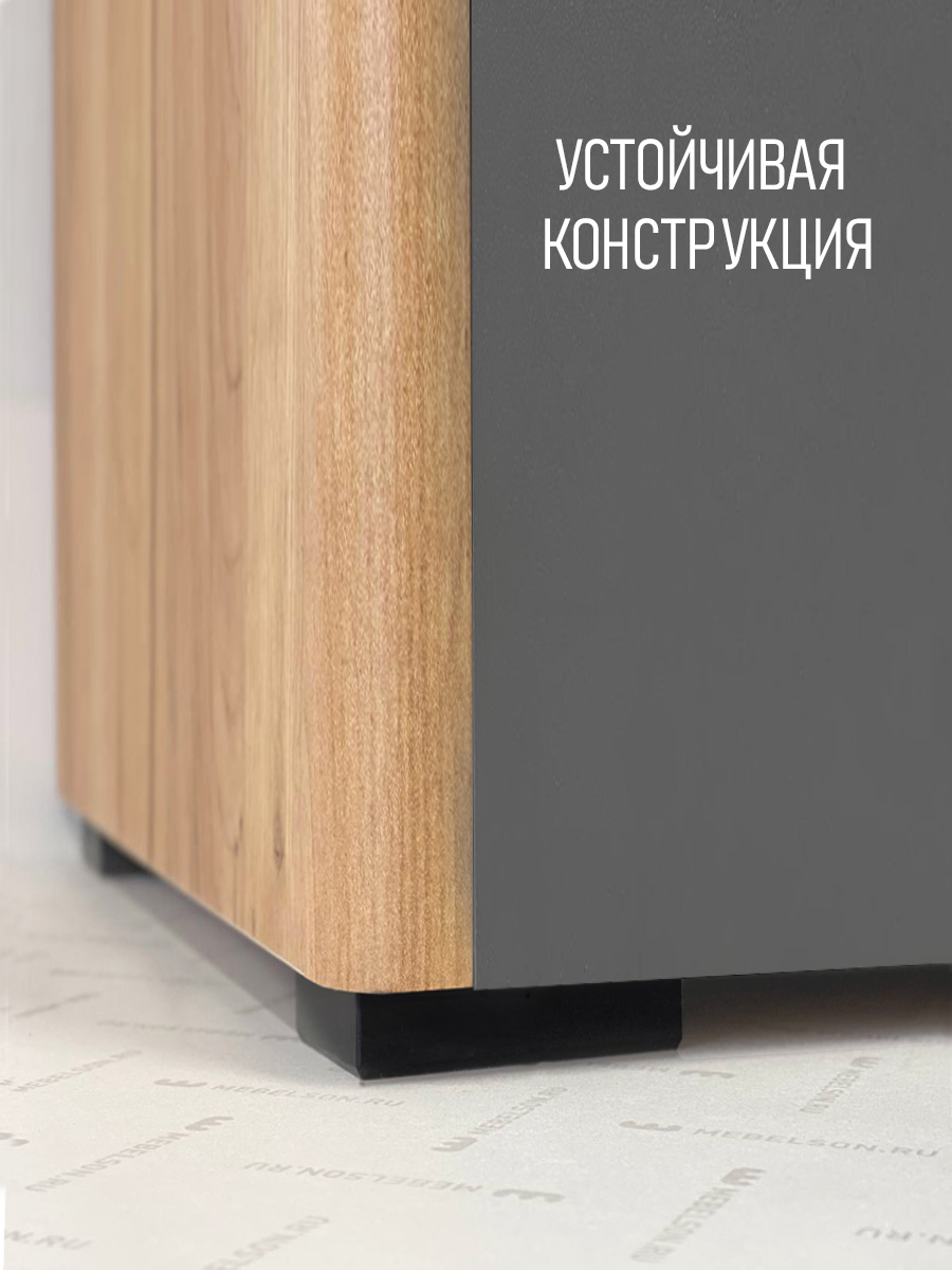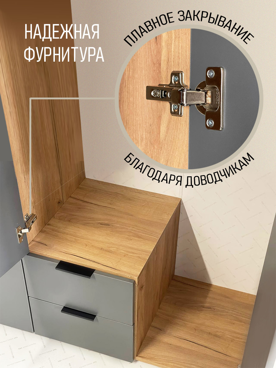 Качественная фурнитура: 4-шарнирные петли с доводчиками обеспечивают плавное и бесшумное закрывание дверей. Регулируемые опоры (20 мм) позволяют выровнять шкаф на неровном полу.