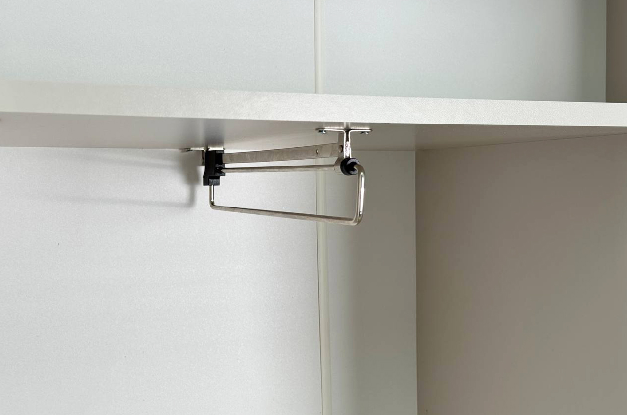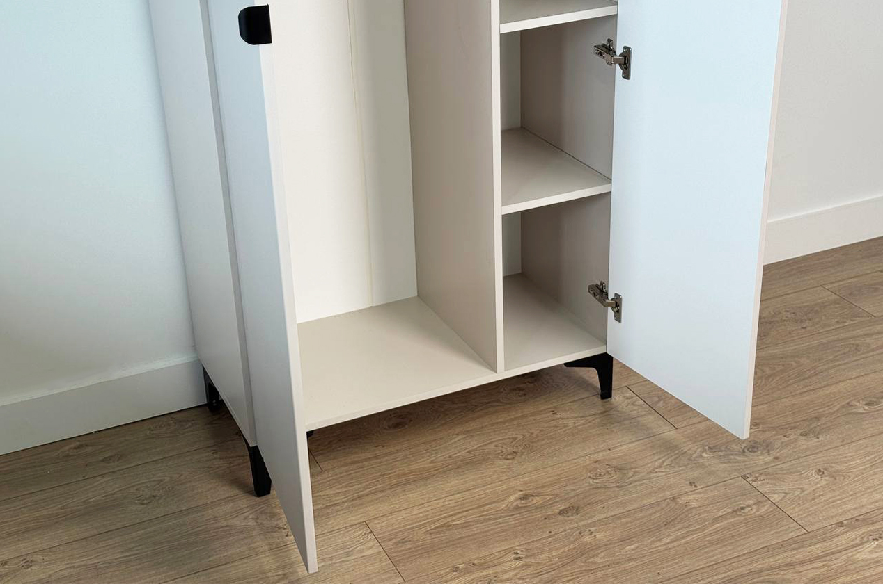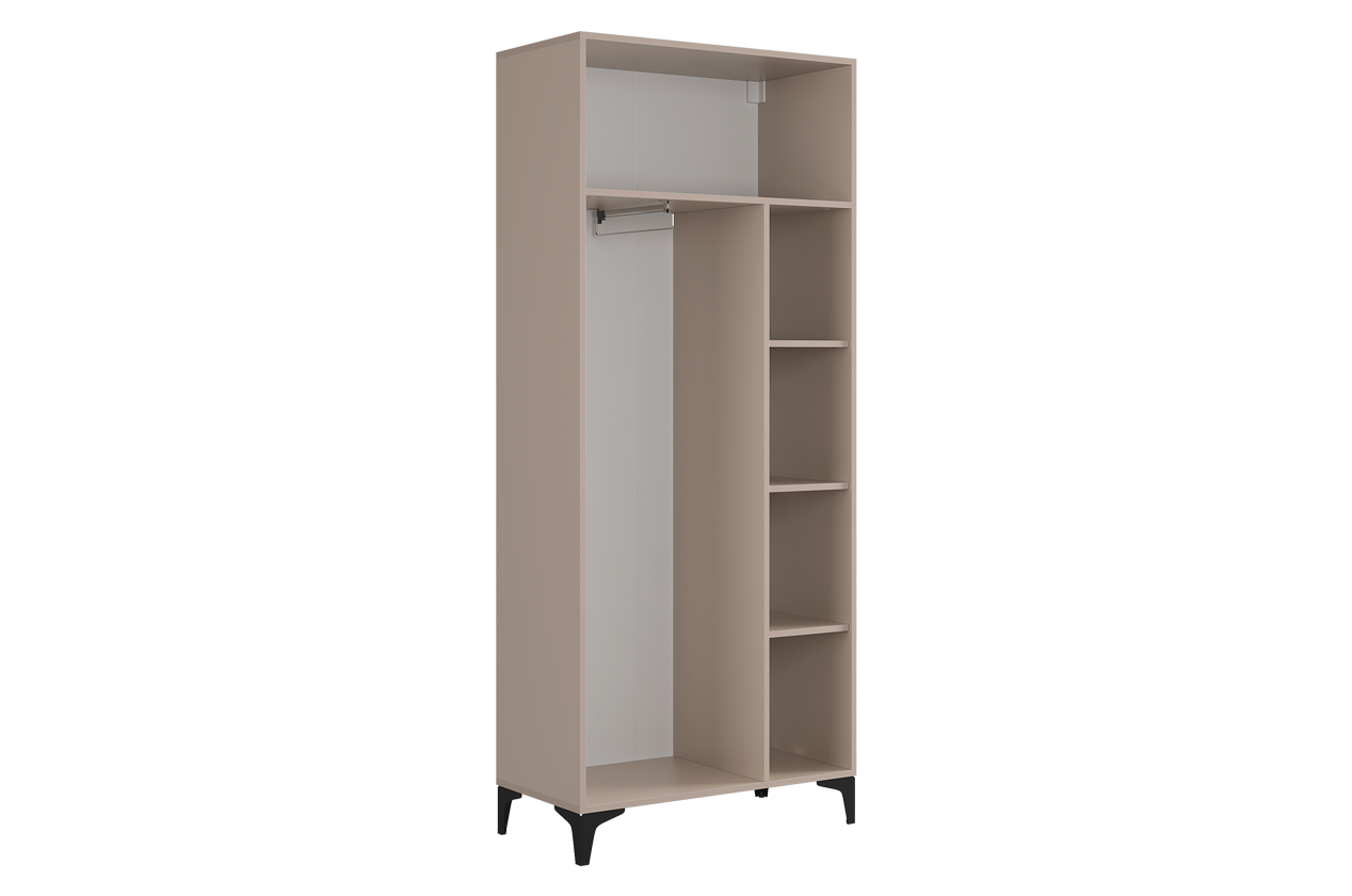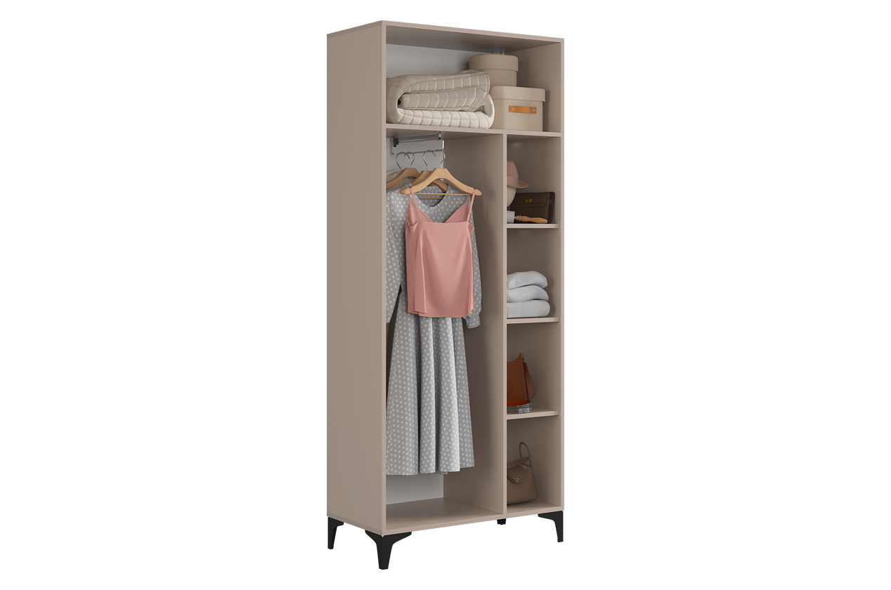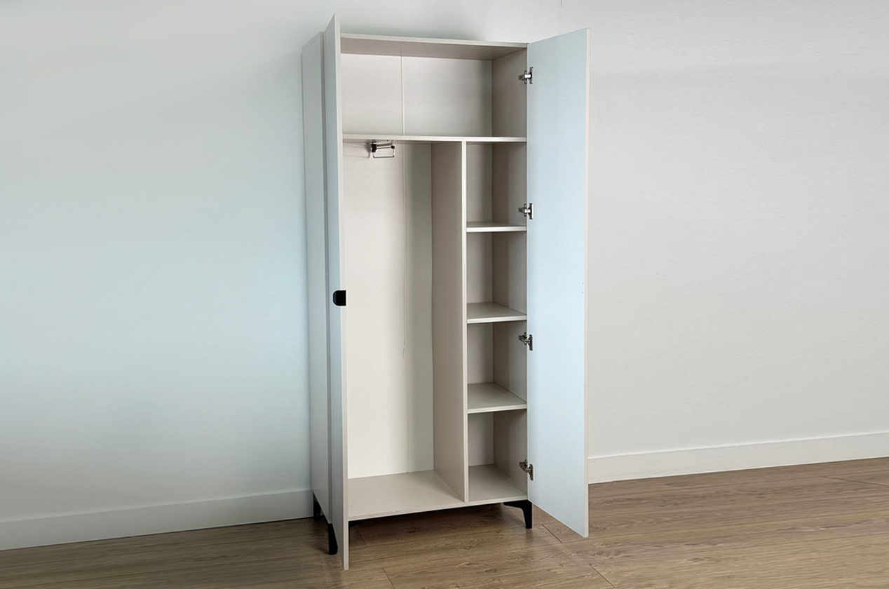 • • Умная организация: Продуманное внутреннее пространство с полками и штангой для вешалок позволяет удобно хранить разные типы вещей.