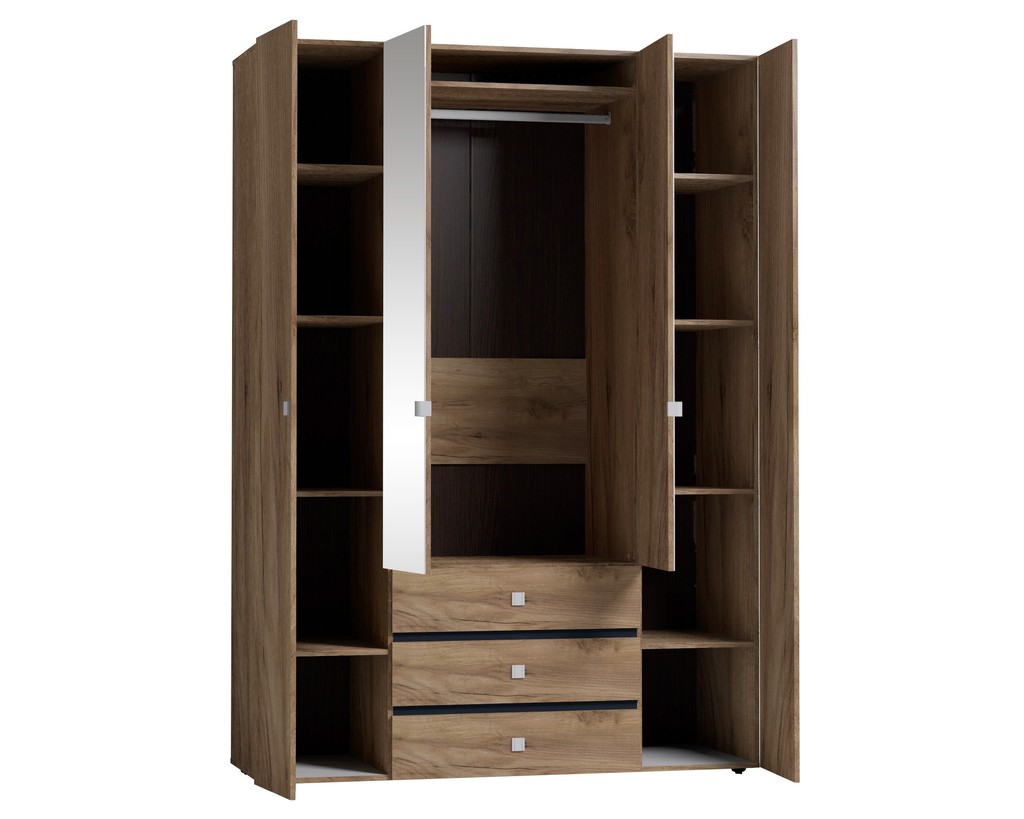 Две симметричные секции с четырьмя полками, высоту которых можно менять под любой тип вещей.