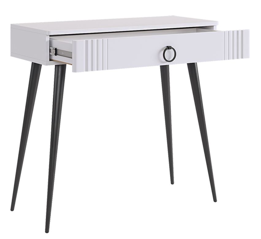 Контрастные оттенки, используемые в оформлении стола, делают его универсальным решением для различных стилей интерьера. Белый цвет фасадов и темные элементы, такие как металлическая фурнитура, добавляют строгости и четкости, что позволяет легко интегрировать этот предмет мебели в любой декор — будь то минимализм, скандинавский стиль или классика.